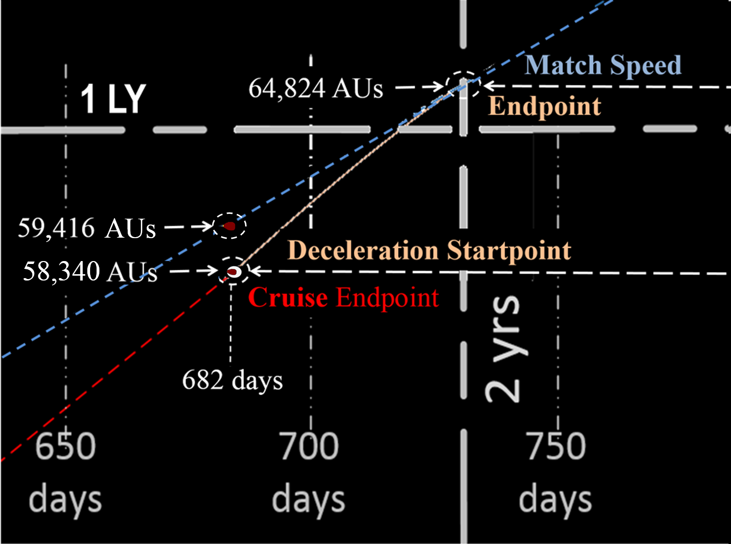 ⓕ 684 days: When resupply vessel reaches 1,076 AU behind the pax vessel, it prepares to decelerate. Cruise segment ends at point where deceleration starts.
